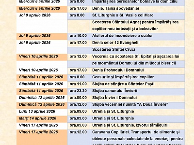 Luni – joi, ora 17.00: Canonul Sfântului Andrei Criteanul, urmată de Taina Spovedaniei; Vineri ora 17.00: Sfânta Liturghie a Darurilor mai înainte sfințite și Taina Spovedaniei; (în celelalte vineri…