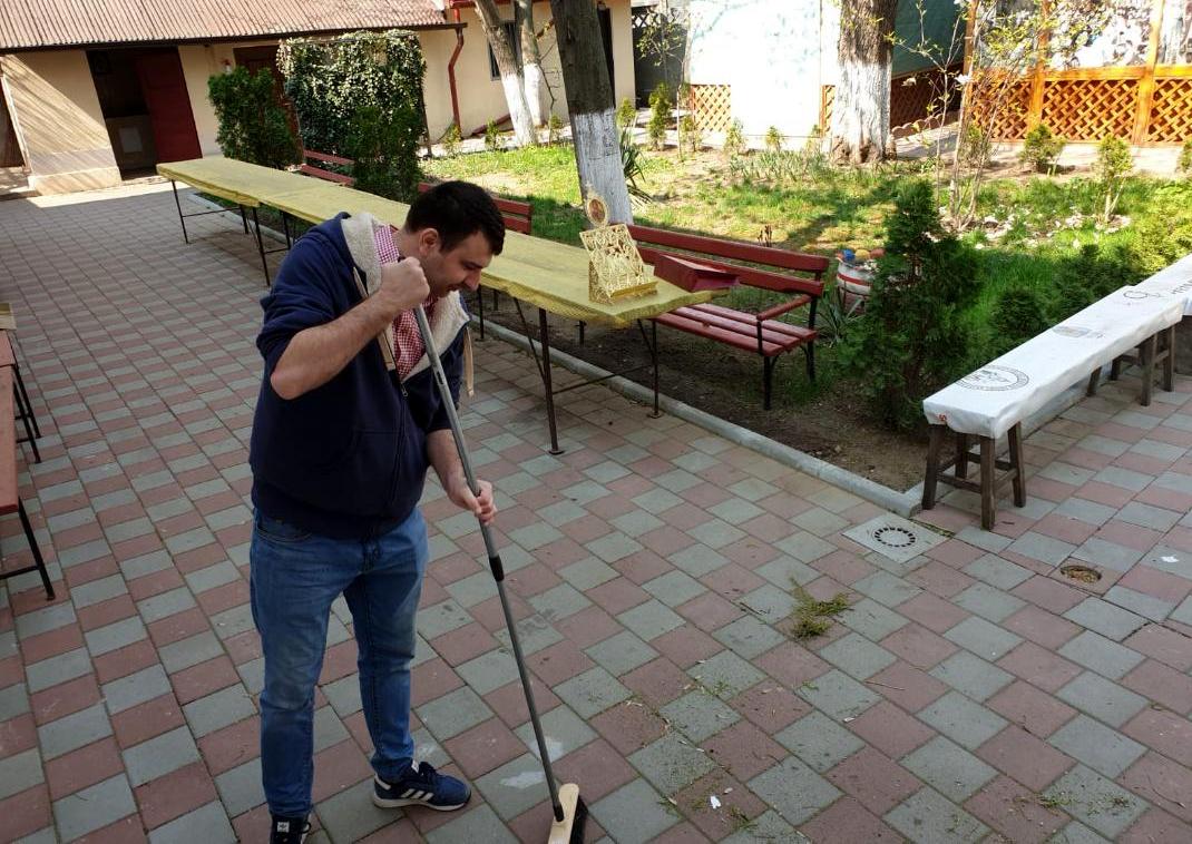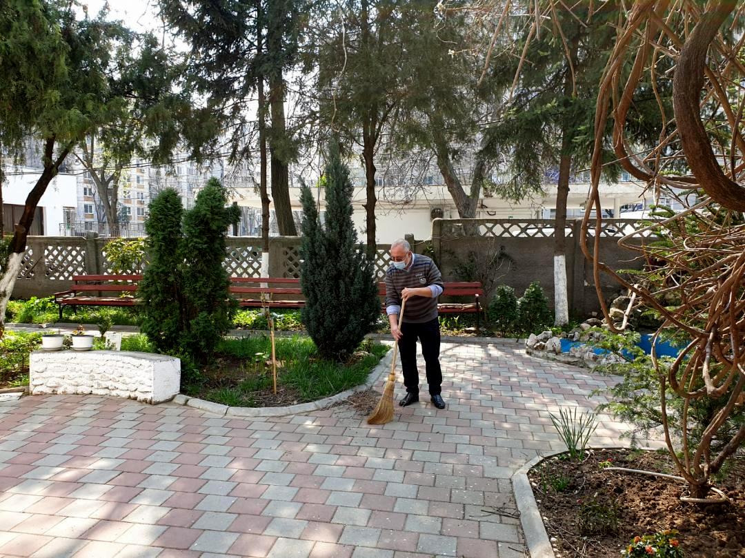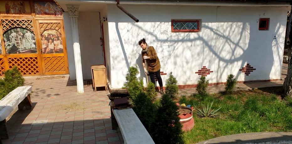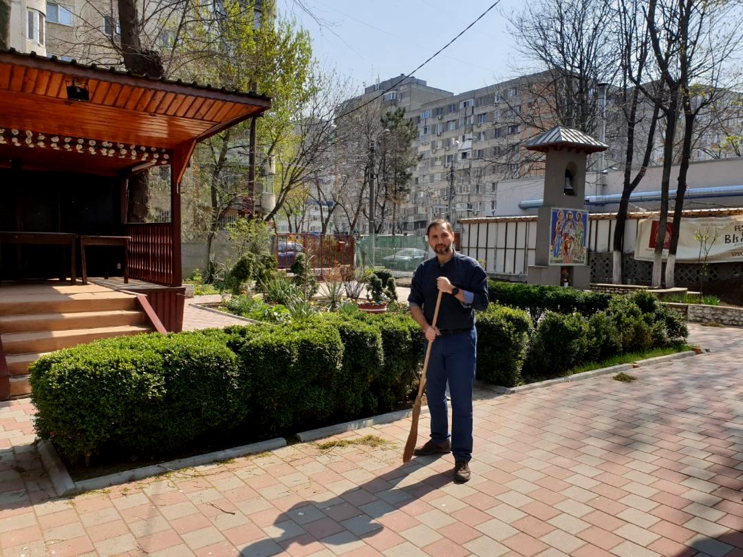 Luni dimineața, preoții parohiei împreună dascălul, ajutați, cu amabilitate, de doamna Mihaela Ciocârlan (voluntar), au purces la realizarea curățeniei (dezinfectarea) sfântului locaș și a curții parohiale. Au fost șterse strănile și mobilierul, a fost aspirată mocheta din biserică și din sfântul altar și a fost spălată cu dezinfectant folia care acoperă mocheta din interiorul bisericii. Apoi s-a măturat curtea parohiei și au fost strânse gunoaiele (frunzele) depuse pe pavaj de copacii existenți în curtea bisericii.